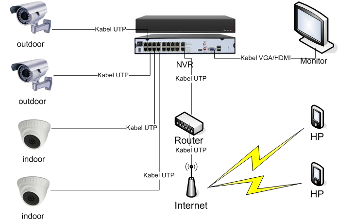 7. Kabel yang digunakan adalah kabel UTP akantetapi ada yang tidakperlu menggunakan kabel UTP apabila jenis NVRnya sudah mendukung Wireless dan tetnunya kameranya juga sudah mendukung Wireless
